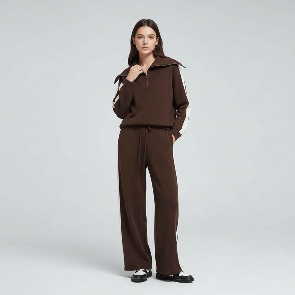Son haut à demi-zip et col large apporte une touche de sophistication, tandis que le pantalon taille haute au tombé droit allonge la silhouette. Les bandes contrastées sur les manches ajoutent une note sportive et élégante — parfaite pour vos journées actives ou vos moments cocooning.